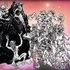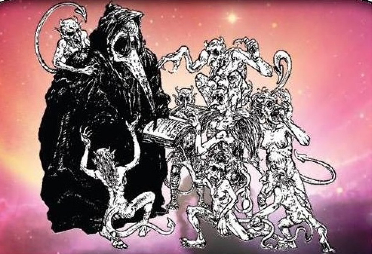 The open book lay flat between us, with the picture staring repulsively upward. As the old man whispered the words “more the same” a tiny spattering impact was heard, and something shewed on the yellowed paper of the upturned volume. I thought of the rain and of a leaky roof, but rain is not red. On the butcher’s shop of the Anzique cannibals a small red spattering glistened picturesquely, lending vividness to the horror of the engraving. The old man saw it, and stopped whispering even before my expression of horror made it necessary; saw it and glanced quickly toward the floor of the room he had left an hour before. I followed his glance, and beheld just above us on the loose plaster of the ancient ceiling a large irregular spot of wet crimson which seemed to spread even as I viewed it. I did not shriek or move, but merely shut my eyes. A moment later came the titanic thunderbolt of thunderbolts; blasting that accursed house of unutterable secrets and bringing the oblivion which alone saved my mind.